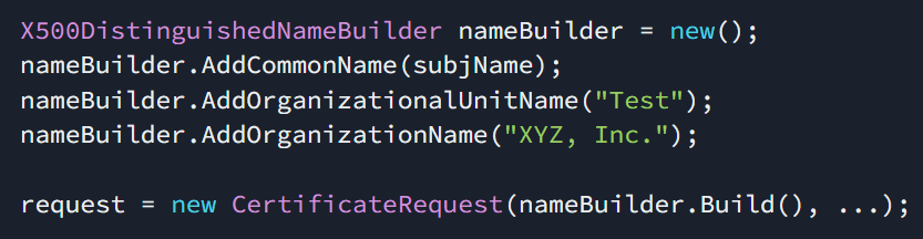 In den früheren Versionen von .NET wurden X.500-Namen mithilfe von Eingabesanierung, Escaping oder einer Kombination aus beidem erstellt. Das Problem bei dieser Art der Erstellung ist, dass sie nicht sicher und einfach zu verwenden ist.