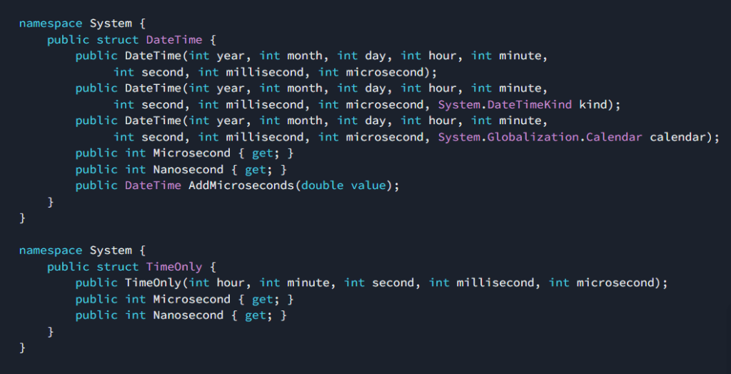 Vor Preview 4 war die kleinste verfügbare Zeiteinheit in den verschiedenen Datums- und Zeitstrukturen der „Tick“, der in der Eigenschaft Ticks verfügbar war. In .NET ist ein einzelner Tick 100ns. Entwickler mussten traditionell Berechnungen mit dem „tick“-Wert durchführen, um Mikrosekunden- und Nanosekundenwerte zu ermitteln. Daher wurden Mikrosekunden und Nanosekunden zu den DateTime-, TimeStamp-, TimeOnly- und DateTimeOffset-Strukturen hinzugefügt.
