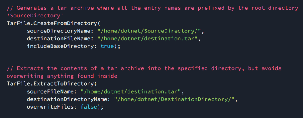 TAR ist ein beliebtes UNIX-basiertes Archivierungsformat, das zum Verpacken mehrerer Dateien wie Audio, Videos, Installationsprogramme usw. verwendet wird. In .NET 7 können wir neue Tar-APIs zum Lesen und Schreiben von Tar-Archiven verwenden. Sehen wir uns ein Beispiel für die Verwendung an: